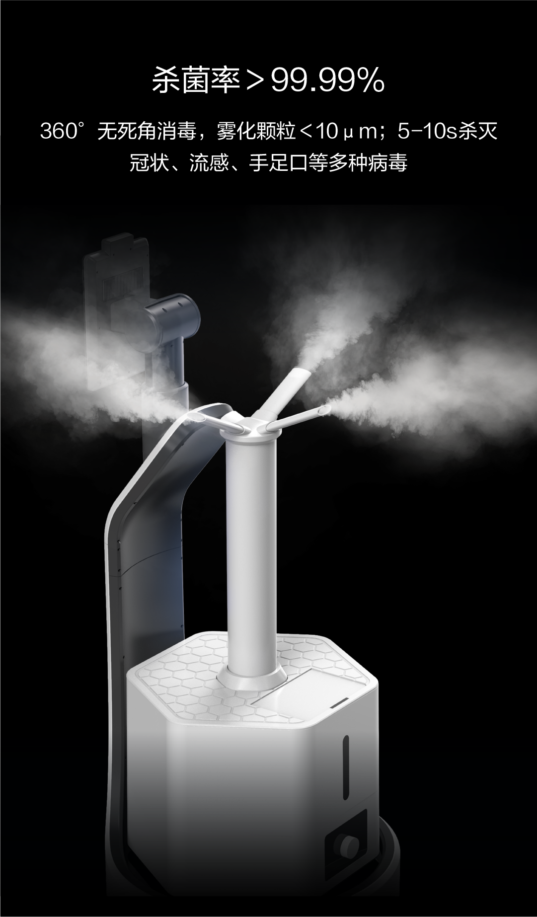 360°无死角消毒,雾化颗粒<10μm;5-10s杀灭冠状、流感、手足口等多种病毒